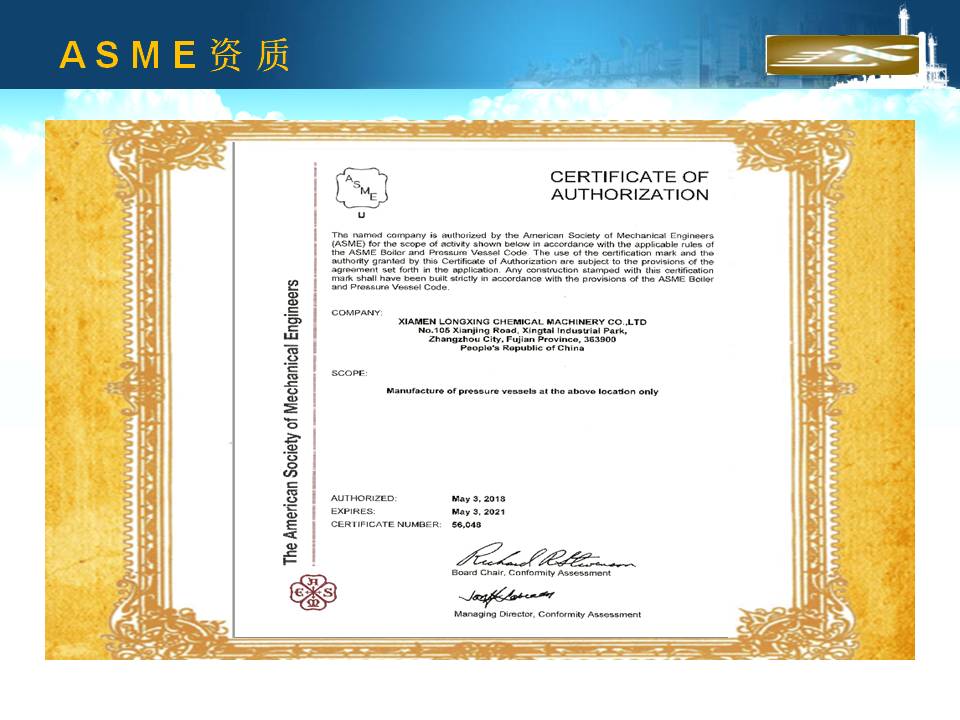 廈門隆興化工機(jī)械有限公司成立于2001年5月,占地面積30000平方米,擁有生產(chǎn)車間面積10000平方米及相關(guān)配套的辦公場(chǎng)所3000平方米,其中下料場(chǎng)所1000平方米,不銹鋼制作場(chǎng)所2000平方米,ASME產(chǎn)品制作區(qū)域1200平方米,無(wú)損曝光室30平方米。公司有職工135人,擁有專業(yè)的技術(shù)人員和管理人員36人。公司主要從事設(shè)計(jì)、制造A2級(jí)覆蓋D類壓力容器...